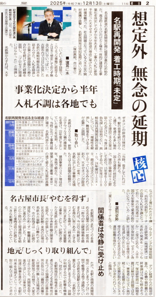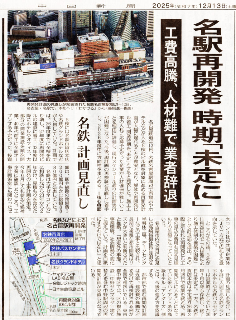 名鉄名古屋駅再開発が白紙に近い計画未定になり、その悪影響を危惧する声が多数出ています。岐阜駅周辺の再開発への悪影響も懸念されます。