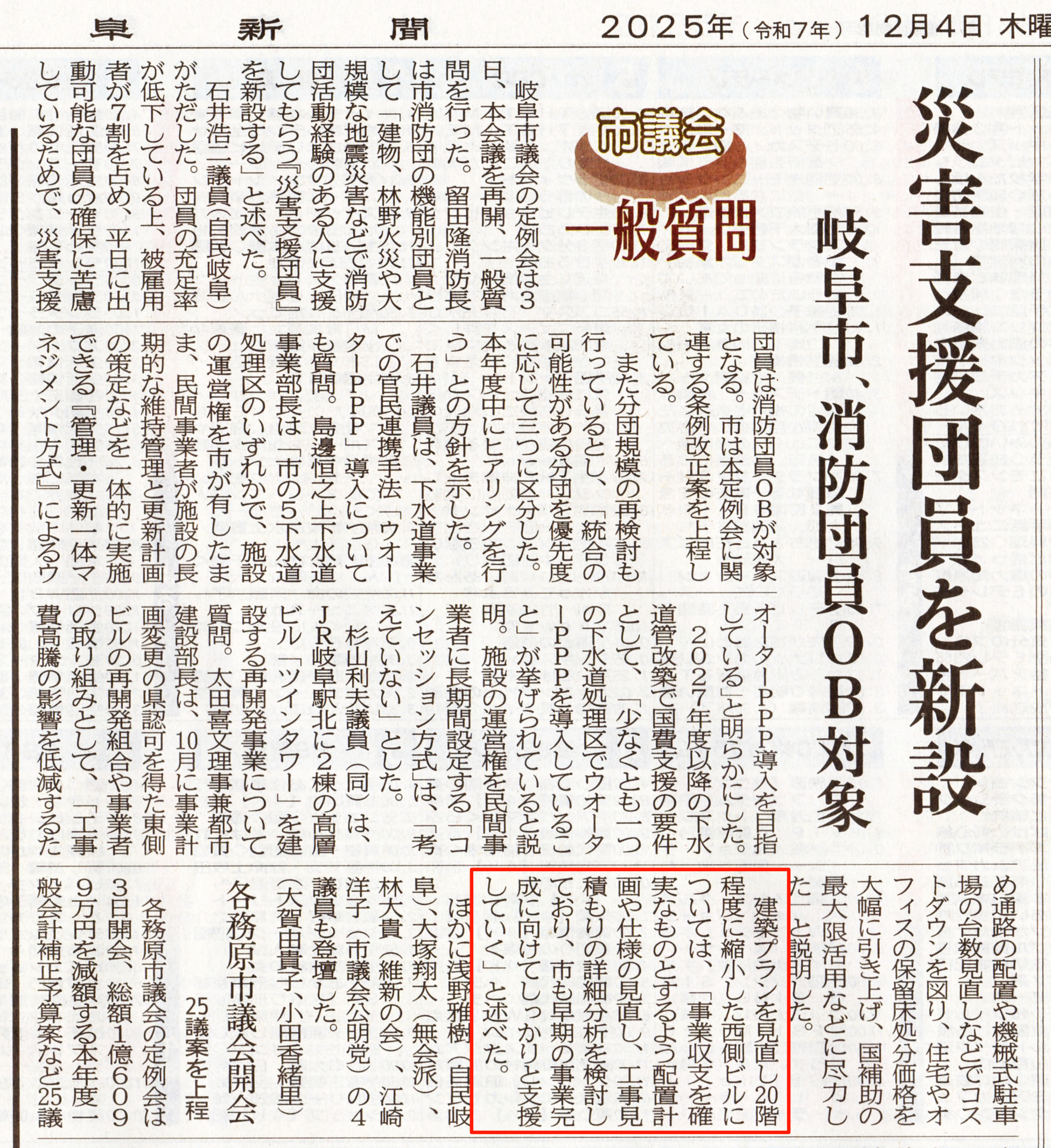 岐阜市議会で自民党岐阜の杉山利夫議員が、岐阜駅前ツインタワーの進捗状況について質疑されました。それに応えて、太田喜文理事兼都市建設部長が答弁されました。岐阜新聞の記事をご参照ください。
